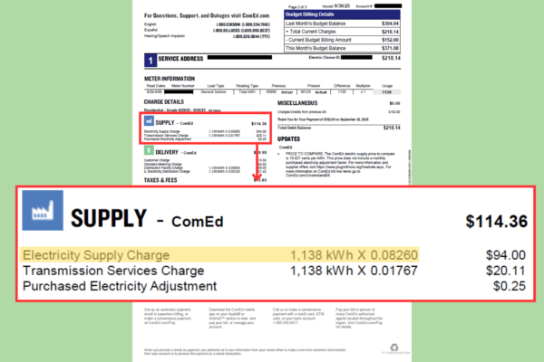 It’s also important to understand the distinction between ComEd and MC2. In a power outage or other emergency, who does one call? Let’s look at this graphic from the Citizen’s Utility Board, where we can better understand that the power lines that deliver the actual energy to our homes are still owned by ComEd, regardless of our participation in this program. The main difference is in the electricity supply and cost. The same section that we just looked at on a sample energy bill.